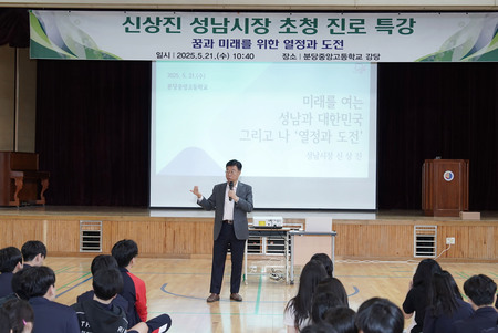 신상진 성남시장은 5월 21일 오전 10시 40분 분당중앙고등학교(정자동 소재)에서 ‘꿈과 미래를 위한 열정과 도전’을 주제로 진로 특강을 했다.